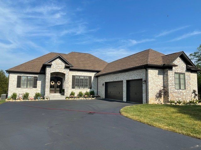 A large brick house with two garage doors and a driveway